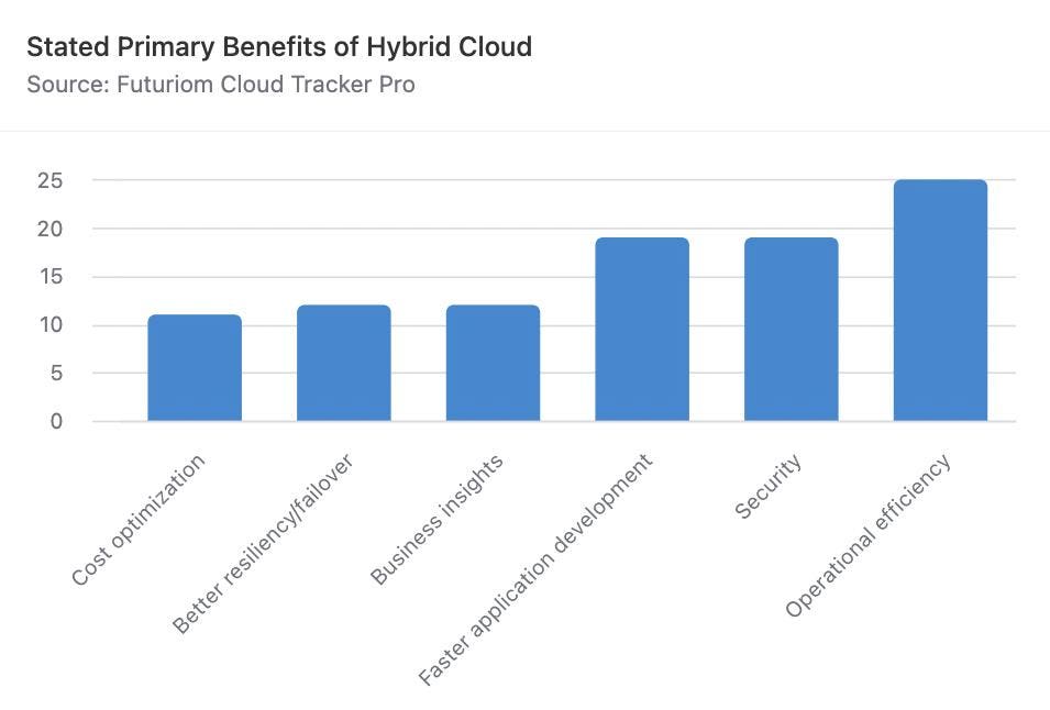Futuriom recently studied 37 hybrid cloud implementations through public records. In citing the chief benefits in public statements, the top three drivers were operational efficiency, security, and faster application development – named in more than half of the examined use cases.