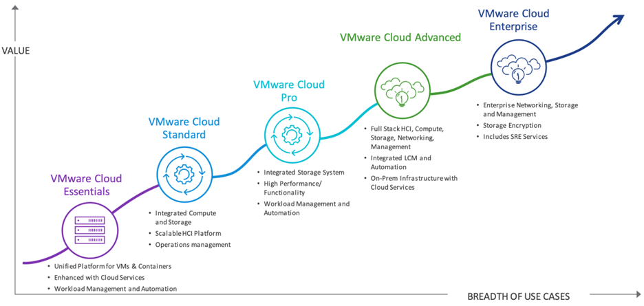 Because not every IT organization is the same in their cloud adoption, VMware Cloud comes in several editions, from Essentials to Enterprise.